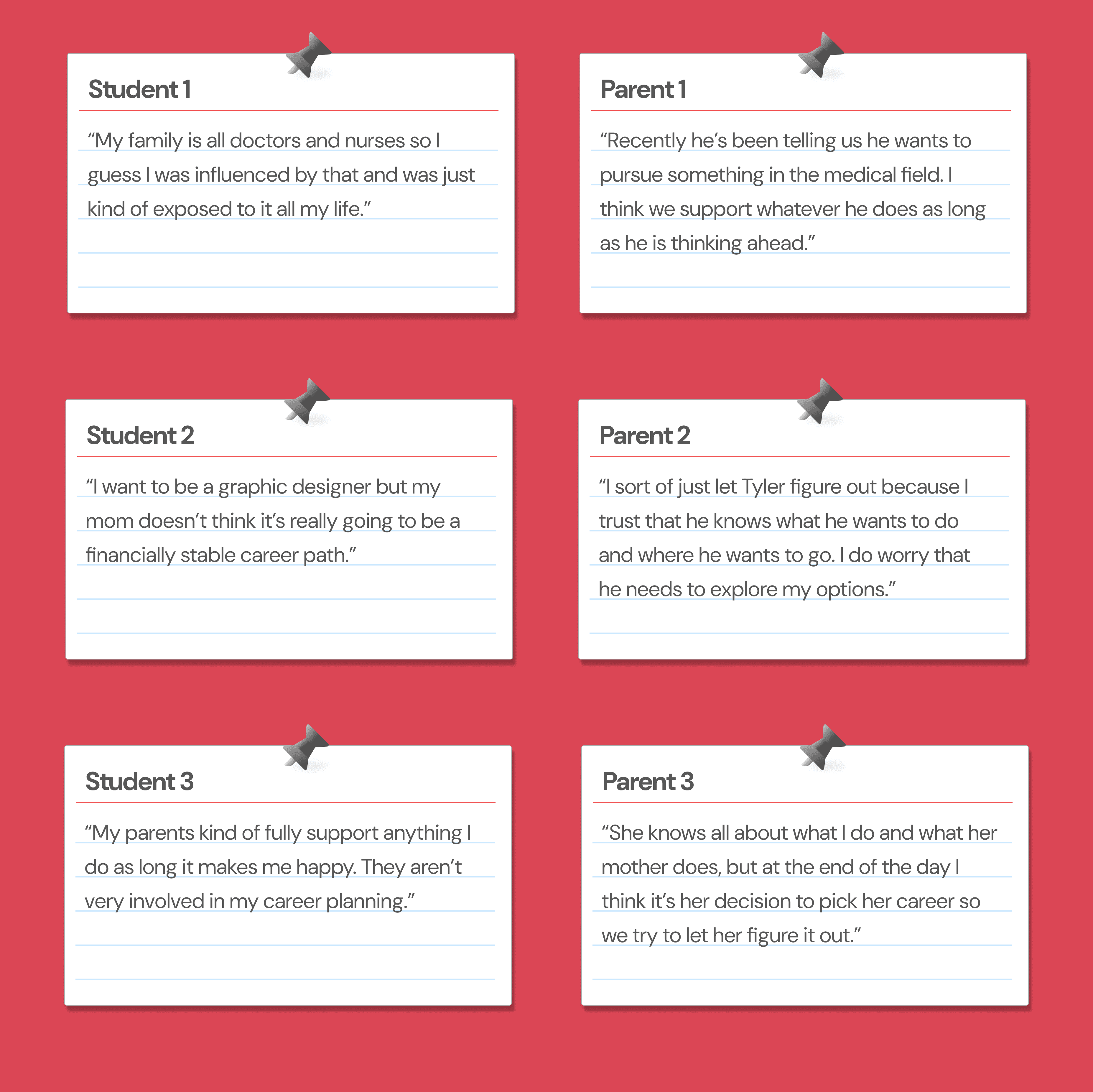 As I continued to analyze the results of our study, it became abundantly clear that a growing issue within our research was that most students we interviewed did not have trouble communicating with their parents, or their parents felt they did not need to interfere with children's career decisions. This issue proved to be more cumbersome as time went on, as we struggled to find additional students to interview who supported our initial hypothesis. Without our target users, we were unable to reach a solid conclusion and collect more data. We ultimately decided that the group of users we initially targeted was too niche and needed to expand our research to an idea that could be tested more feasibly.