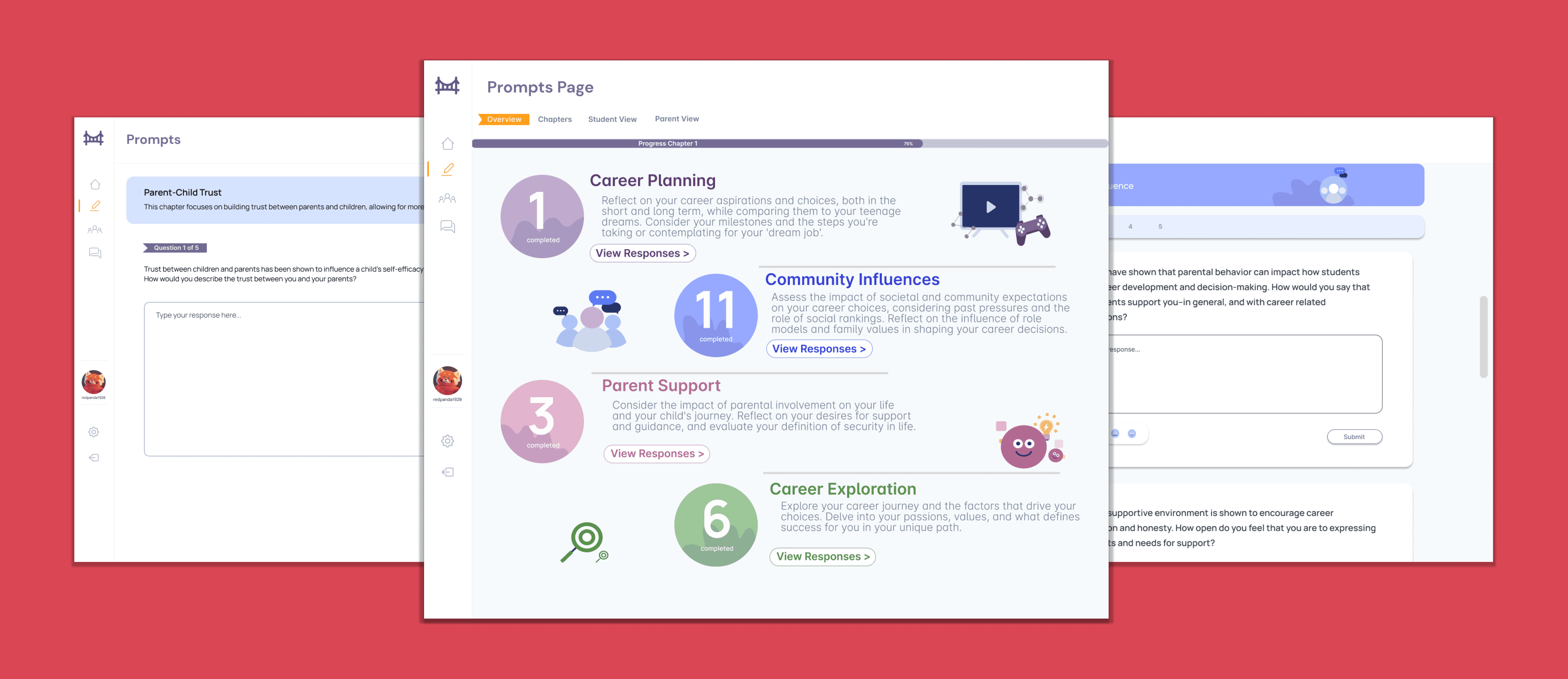 Figure 3.2: Prompts Response Page (Left), Prompts Main Page (Middle), Community Response Submission Page (Right)