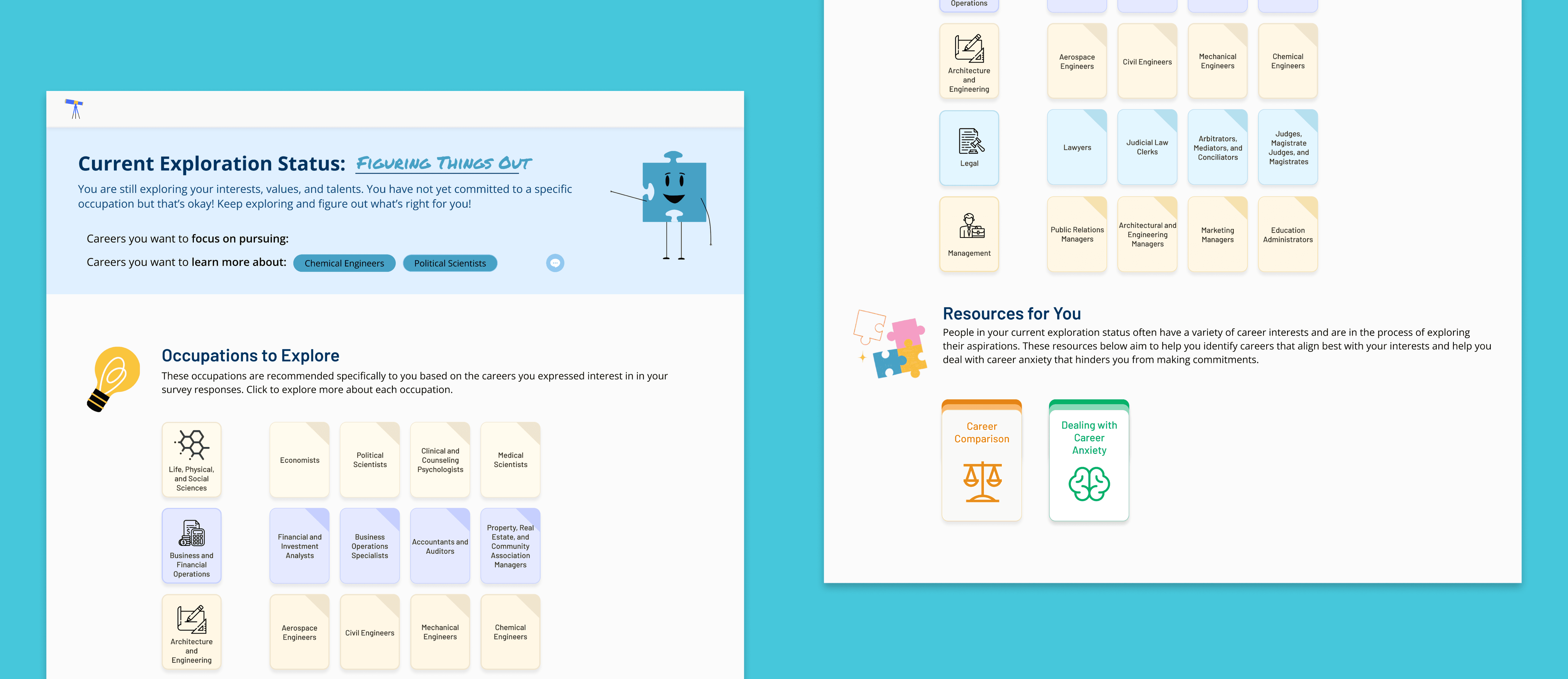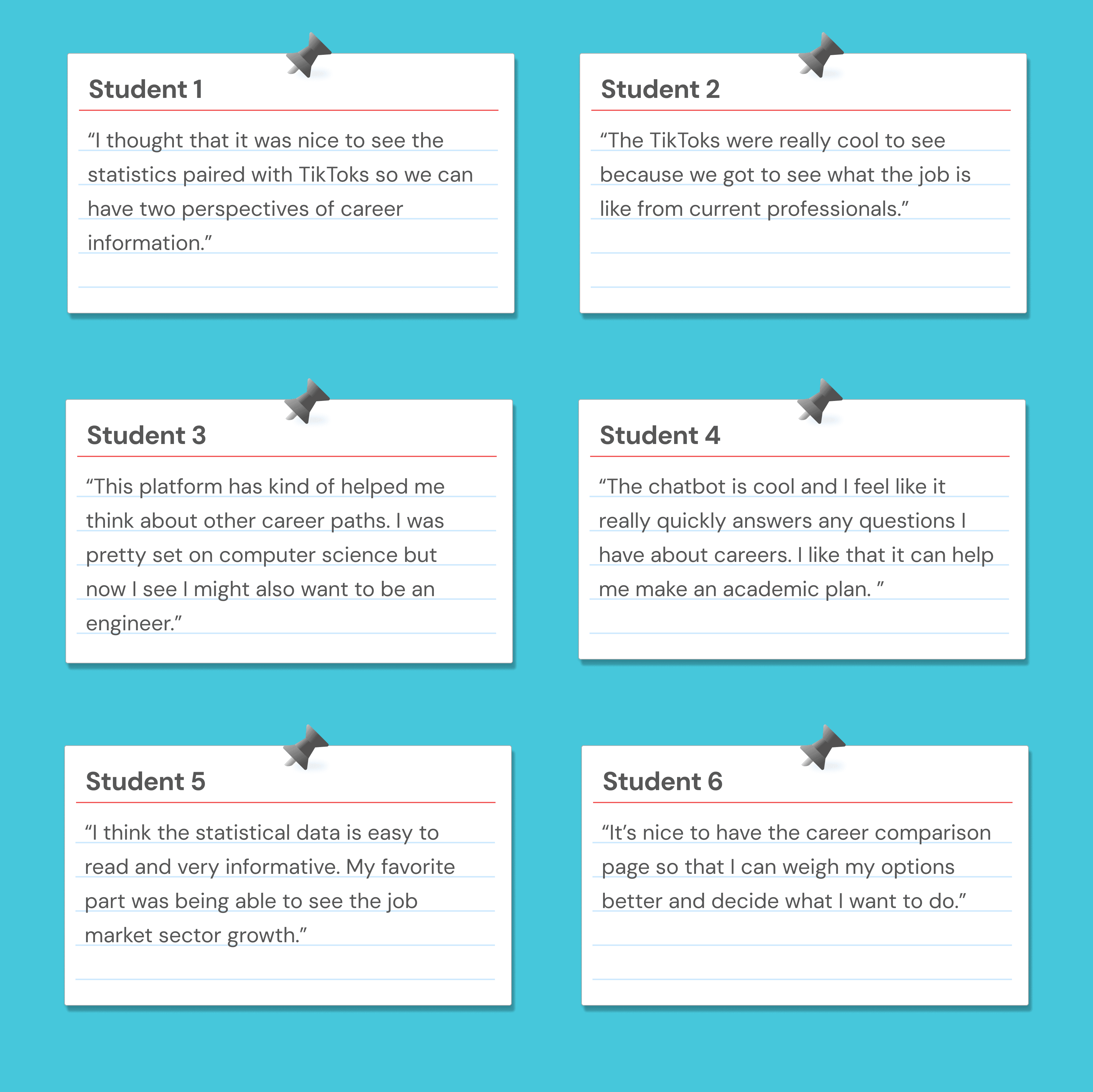 Through our user testing, I determined that students found having all different types of information outlets to be extremely helping in solidifying their current career path or eye-opening for discovering alternative routes. We used this data to expand the discussion around increasing career education and also to improve our current platform.