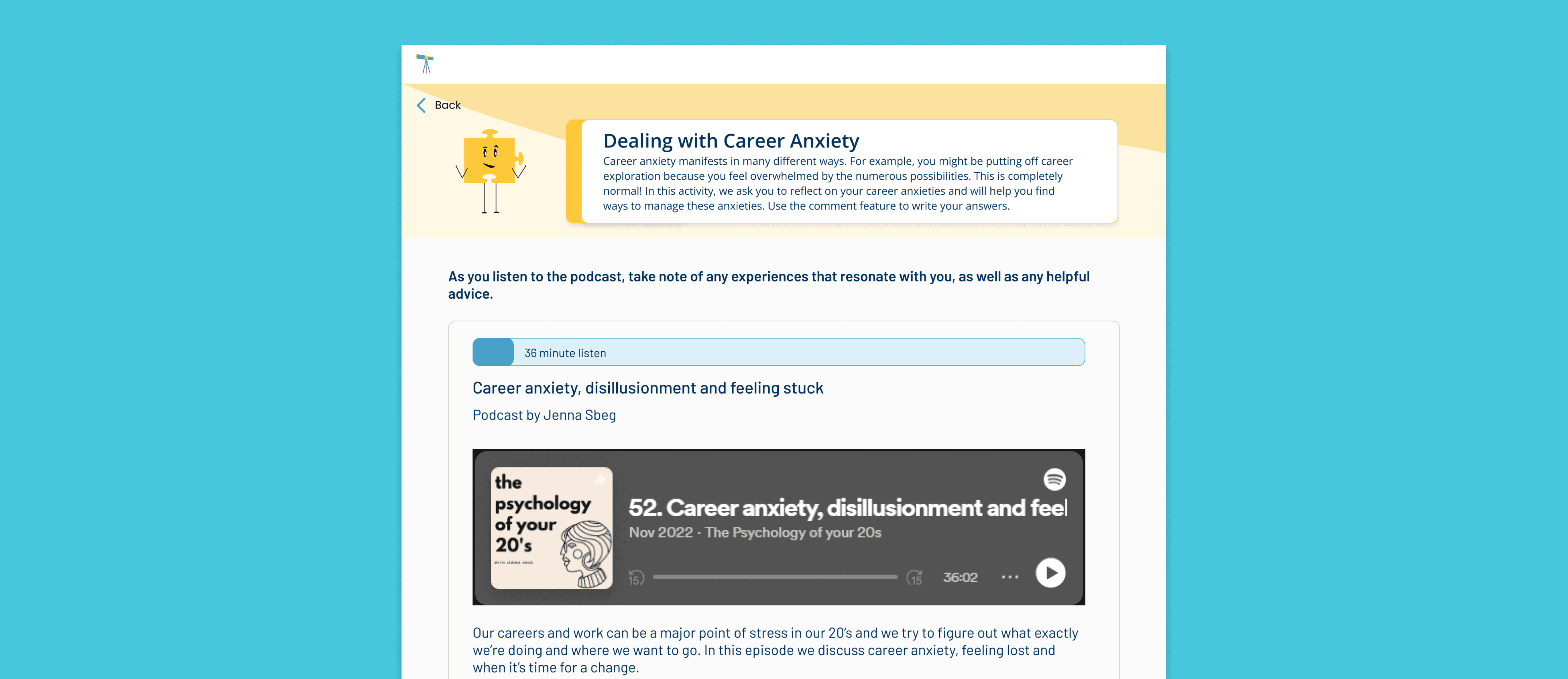 One thing I noticed in our interviews is that students struggling to make career decisions go even beyond just a lack of information. Lots of adolescents struggled with some levels of career anxiety that hinder their ability to make level-headed decisions. Since the goal of our platform is to create a centralized resource for students, I helped create a page dedicated to helping students learn how to deal with their anxious thoughts. I added links to articles to read, podcasts to listen to, and a section that invites students to share their thoughts and suggestions on coping with anxiety.