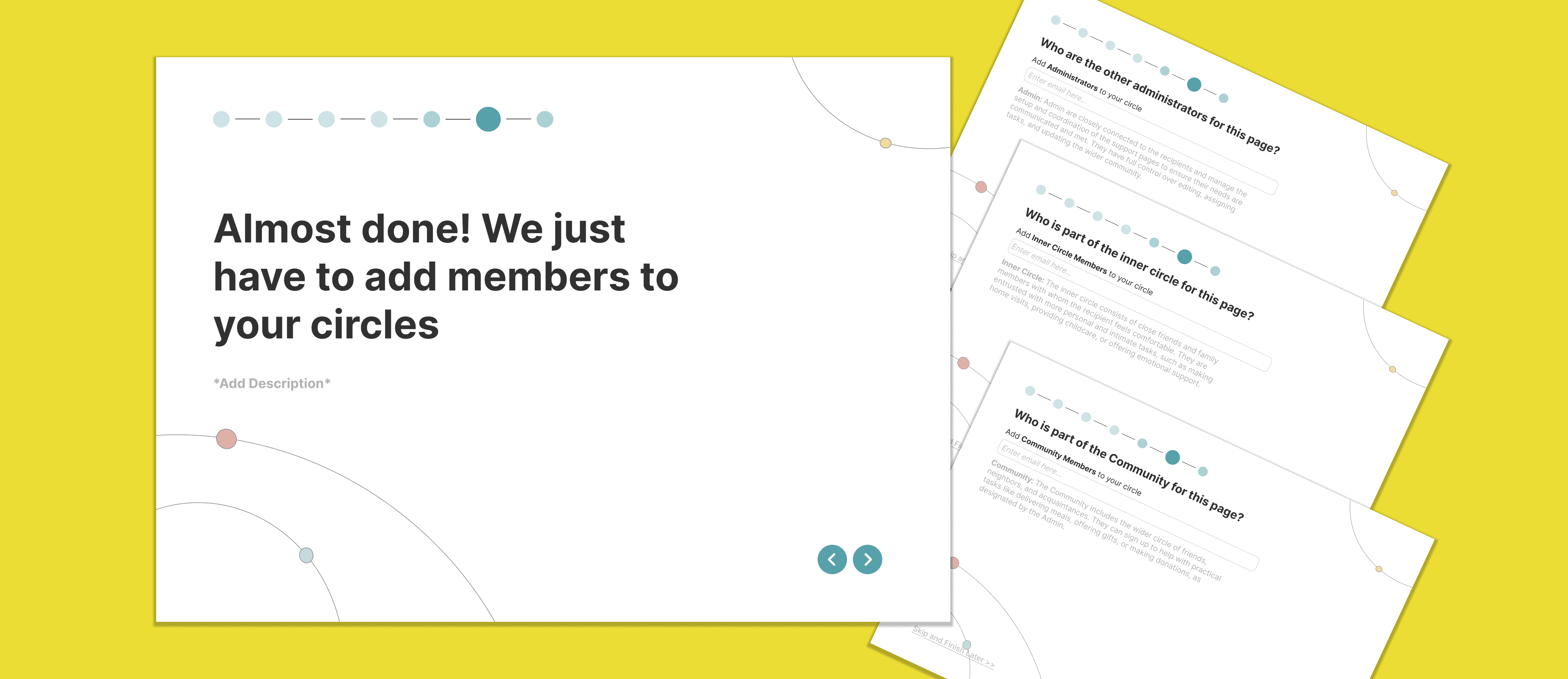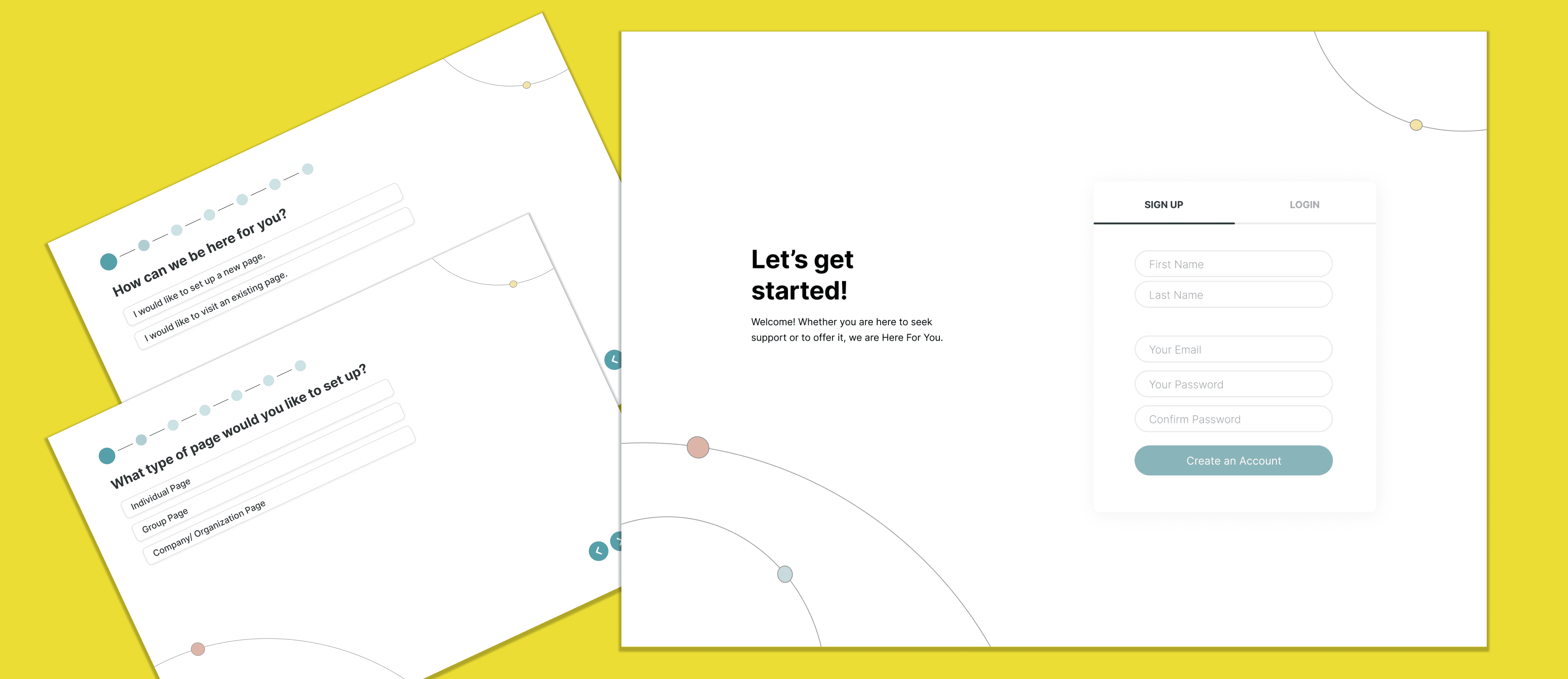 The notes I was given as a designer were to create an inviting presence the moment you reach our landing page, and to keep the overall website simple, without looking overly upbeat. I was also asked to use earthy tones or white to keep the page easy to read, easy to use, and leave room for color changes later. Additionally, my supervisor asked me to try to keep a circle motif to signify our platform's focus-point feature, which is support circles. We wanted to emphasize the idea of community and how our platform will connect people together, forming a digital support circle for anyone who needs it.